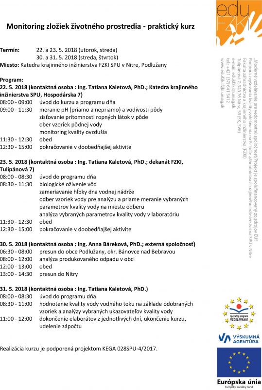 Kurz, 22.-23.5.2018 a 30.-31.5.2018, je určený pre študentov druhého ročníka bakalárskeho stupňa štúdia odboru Krajinné inžinierstvo. Organizátor: Katedra krajinného inžinierstva. Zodpovedná osoba: Ing. Tatiana Kaletová, PhD.