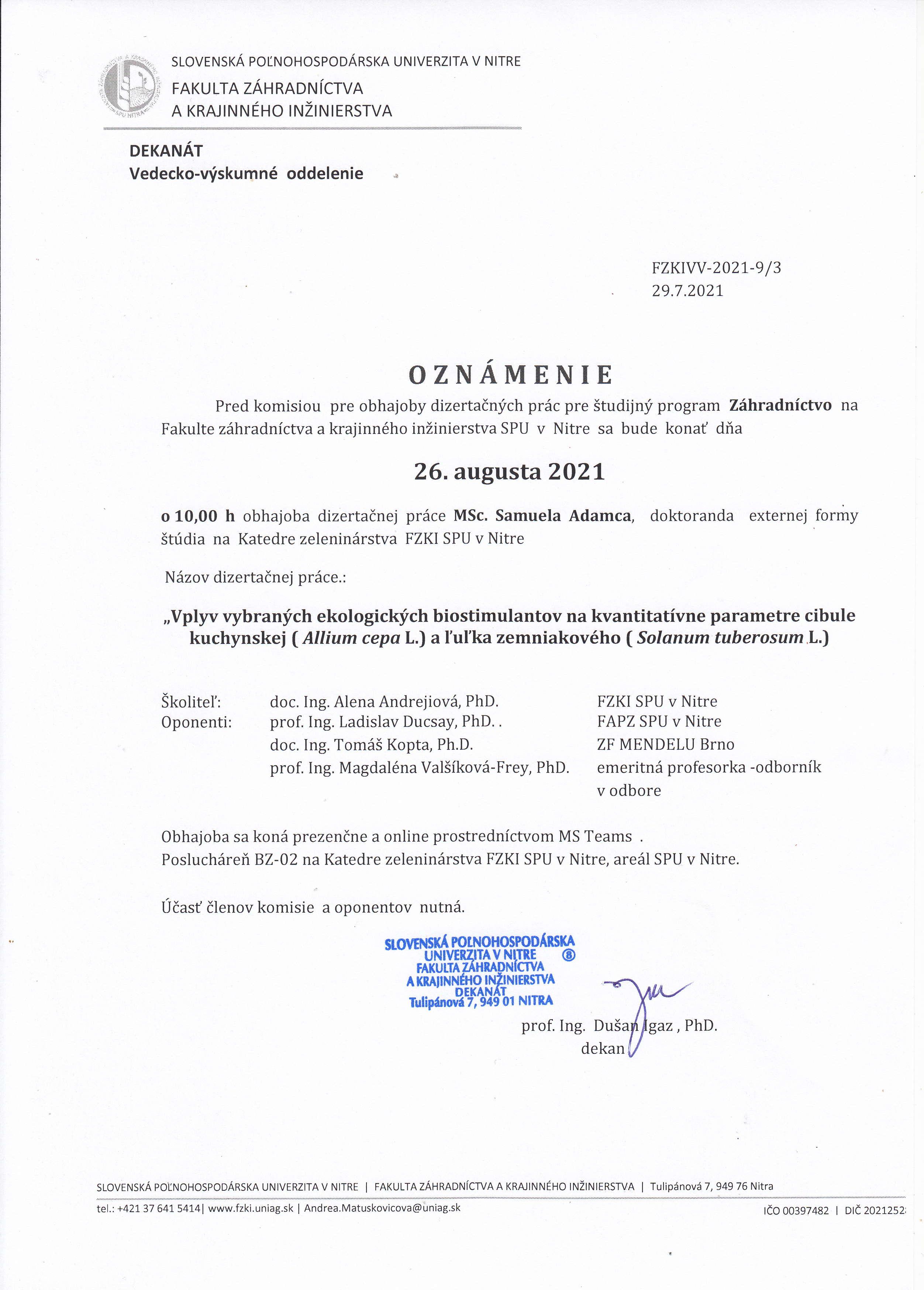 V dňoch 20.08.2021 a 26.08.2021 prebehnú na fakulte obhajoby dizertačných prác Ing. Radka Vincúra (doktorand dennej formy štúdia na Katedre záhradnej a krajinnej architektúry) a MSc. Samuela Adamca (doktorand externej formy štúdia na Katedre zeleninárstva).