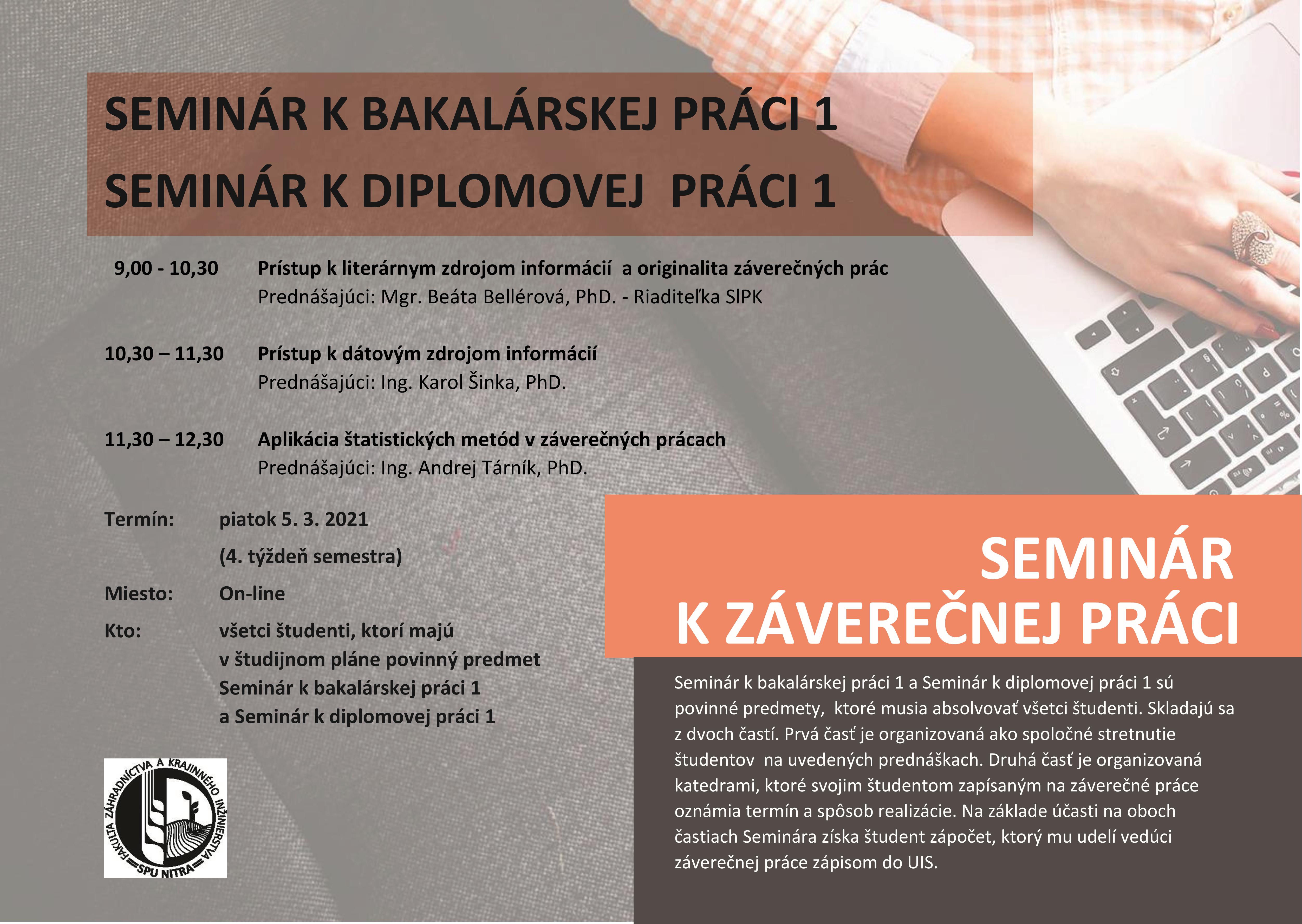 Seminár k bakalárskej práci 1 a Seminár k diplomo vej práci 1 sú povinné predmety ktoré musia absolvovať všetci študenti. Skladajú sa z dvoch častí. Prvá časť je organizovaná ako spoločné stretnutie študentov na uvedených prednáškach. Druhá časť je organizovaná katedrami, ktoré svojim študentom zapísaným na záverečné práce oznámia termín a spôsob realizácie. Na základe účasti na oboch častiach Seminára získa študent zápočet, ktorý mu udelí vedúci záverečnej práce zápisom do UIS.